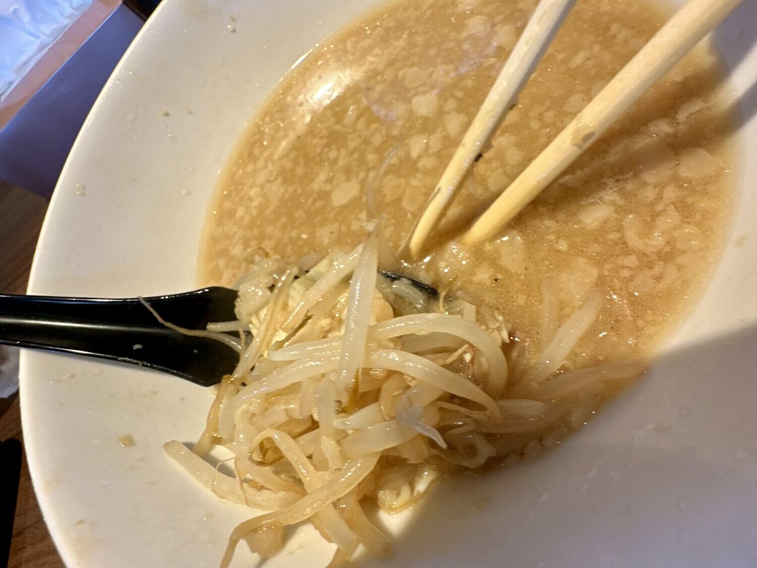 もやしの茹で汁ガマリがうっすら漂うヤサイ、好みの歯触りたけに非常に惜しい