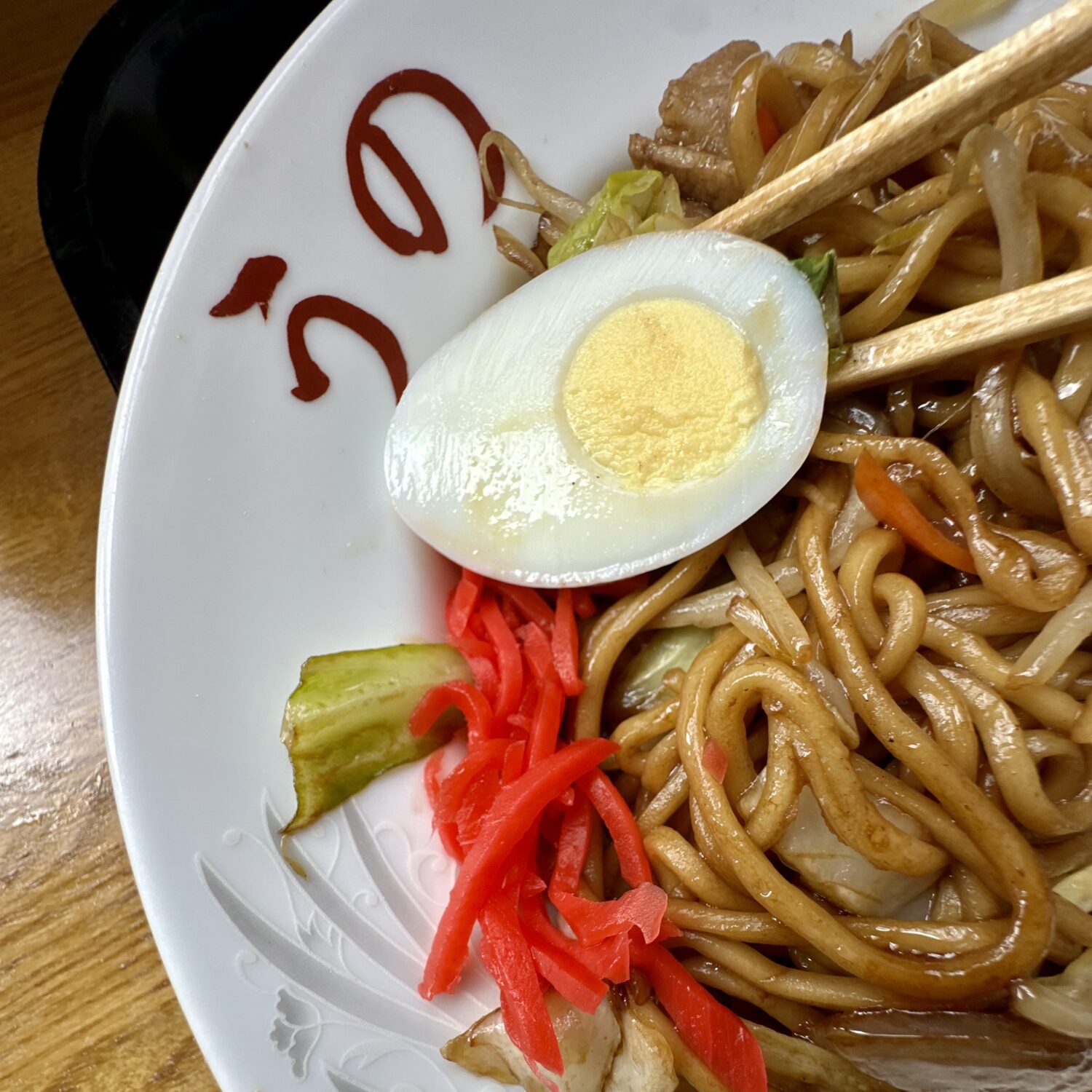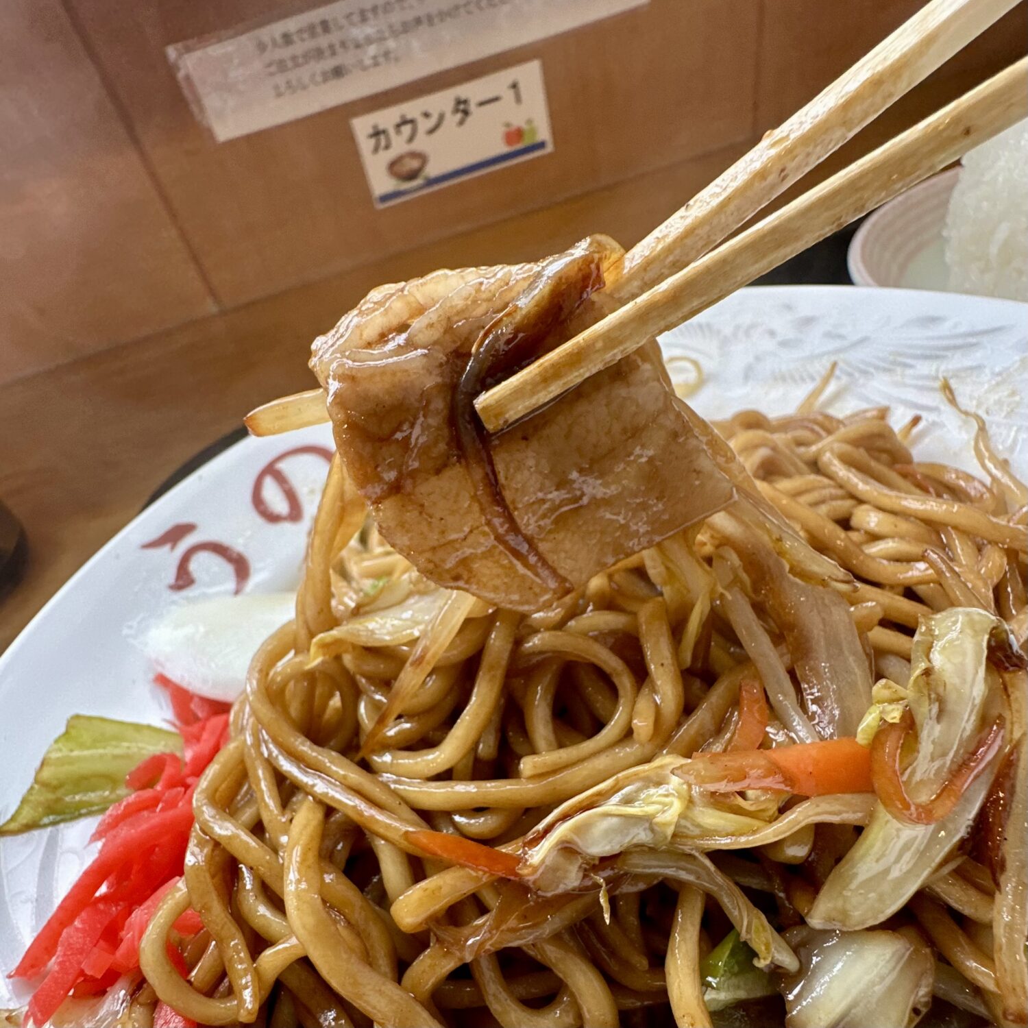 スベスベツルツルの中太麺に、食欲こちょぐる甘辛ソース、強火でザッと炒めたキャベツ&豚肉の黄金コンビ、そして紅ショウガが魅せる甘辛ジョッパの向こう側。
