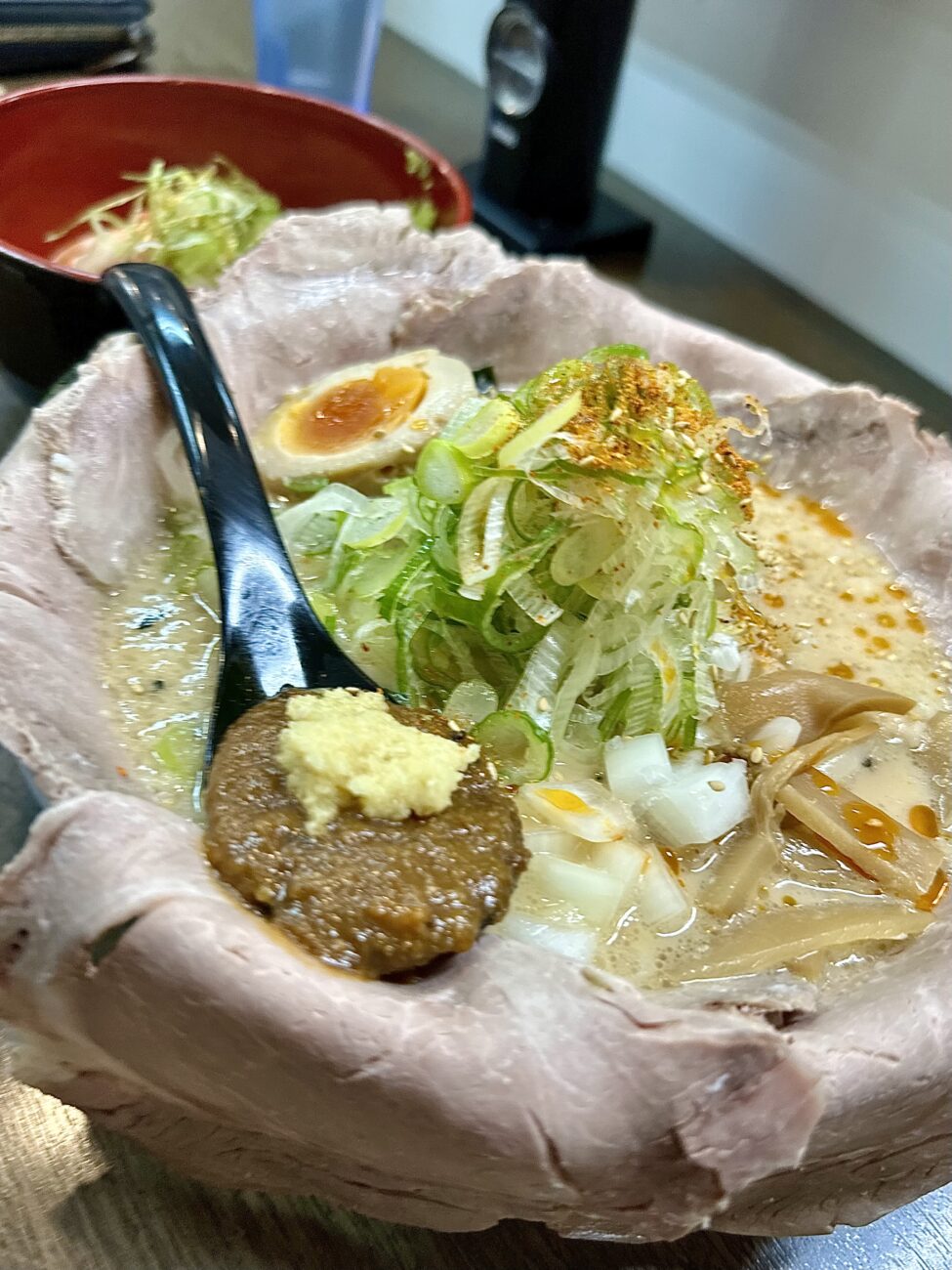 弘前門外【中華そば まる美】でチャーシュー麺と味玉に持ち込みおにぎり